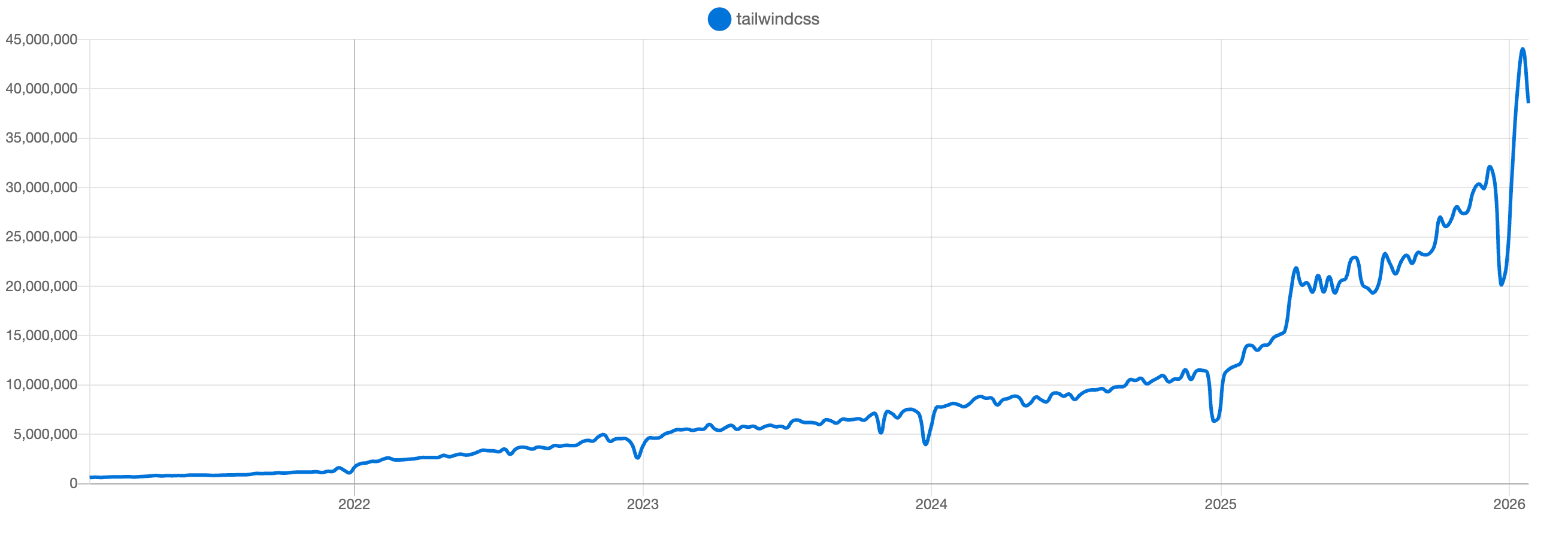 Stack Overflow is just the tip of the iceberg. Unlike Stack Overflow, which is not open source, Tailwind arguably did stand to gain from the rise of LLMs. It was already a popular CSS framework — think pre-built IKEA furniture kits, but for the CSS code that controls how websites look (where HTML is the structure and CSS the interior design). Being highly customizable and easy to use, it lent itself well to agentic use by AI. And Tailwind did indeed become more popular. In 2025, Tailwind received many magnitudes more daily downloads as it received prior to LLM web search and agentic capabilities being released. Yet Tailwind recently announced that the company had to lay off 75% of its engineering team (3 out of 4 staff members) as its revenue plummeted.